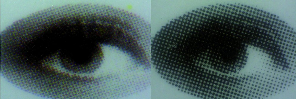 Schlechtes Druckergebnis aufgrund falscher Papierwahl. Links: Druck auf gestrichenem Papier, rechts, Druck auf ungestrichenem Papier.