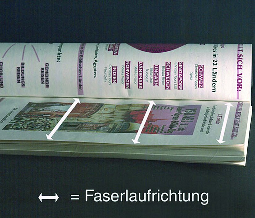 Aufbrechen der Klebebindung durch “falsche” Laufrichtung des Papiers im Rollenoffset. Es handelte sich um eine “liegende” Produktion, folglich um Laufrichtung senkrecht zum Buchrücken.