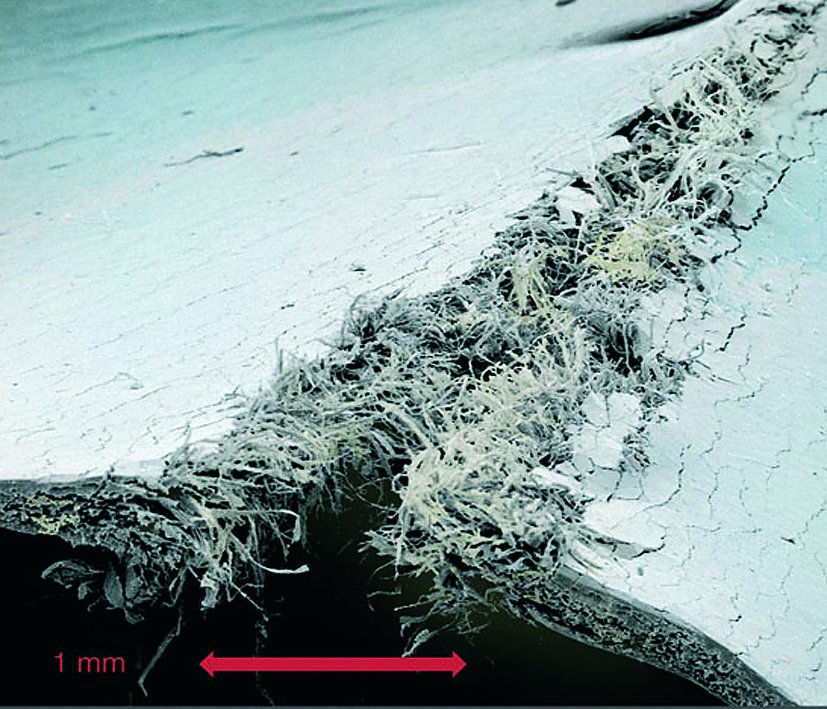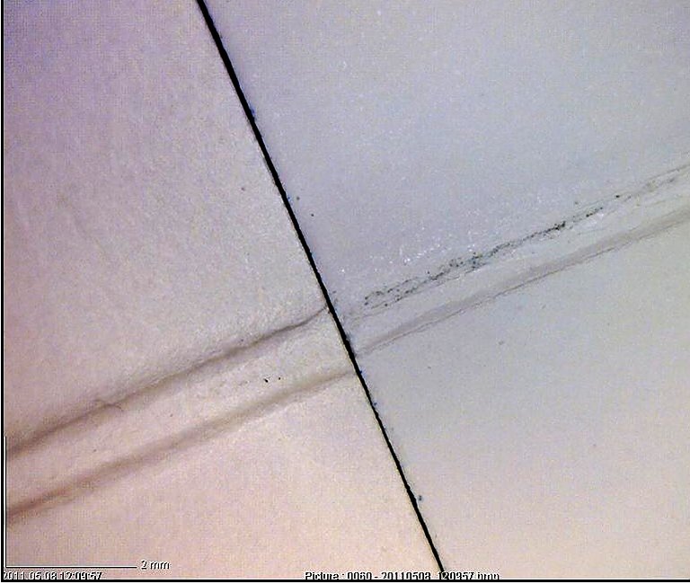 REM (Raster Elektronen Mikroskop) Aufnahme eines Falzbruches.