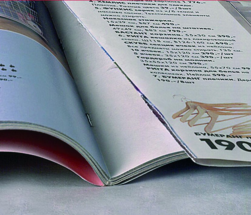 Starke Welligkeit im Buchblock eines im Rollenoffset gedruckten Kataloges. Zusätzlich traten starke Scheuerspuren während des Transports auf, weil die Kataloge schlecht abgestapelt waren.