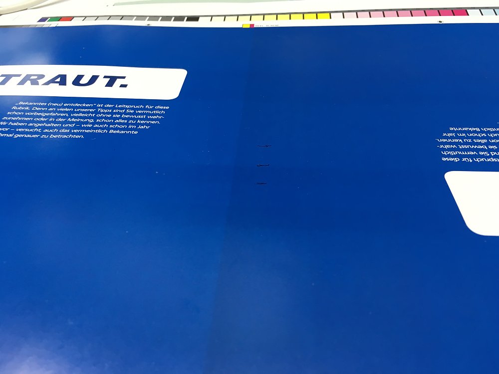 Fehlpasser, Streifen, Falzbrechen, Farbabrieb… in diesem Bereich finden Sie einige Bildbeispiele von Gutachtenfällen mit kurzen Fehlerbeschreibungen.
